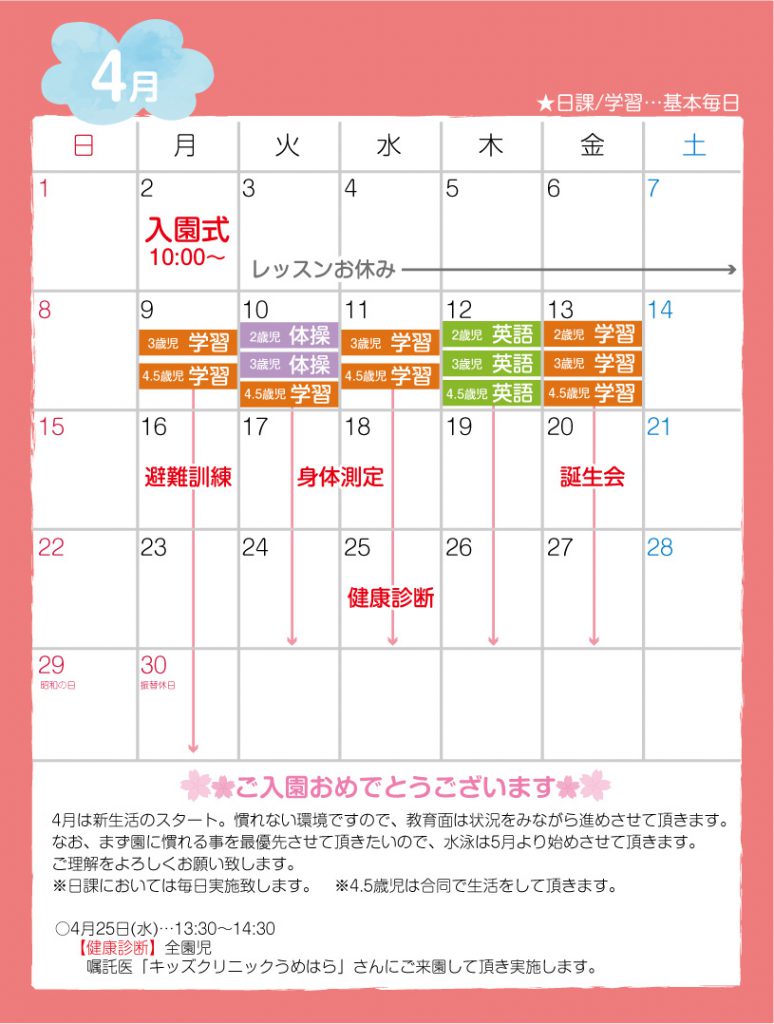 なお、まず園に慣れる事を最優先させて頂きたいので、水泳は5月より始めさせて頂きます。