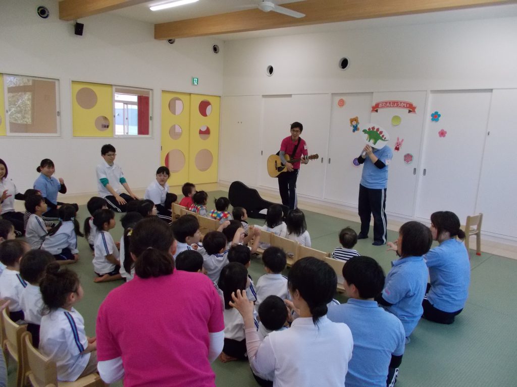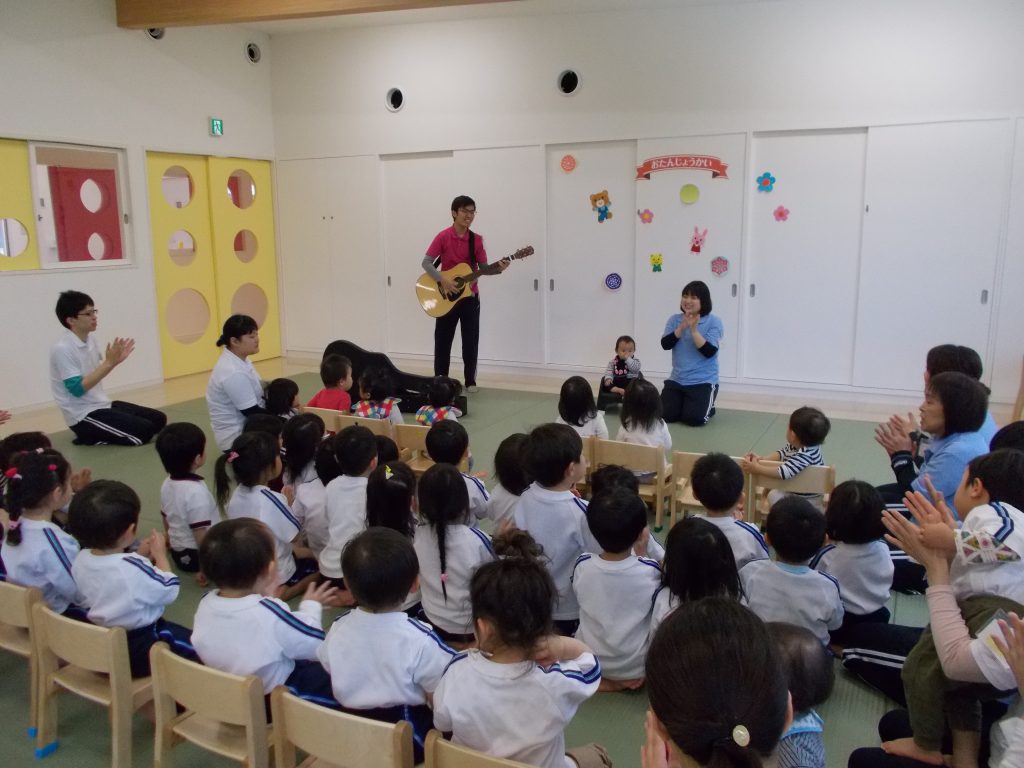 K先生のギターで「ひらひらパチン」と「なぞのたまご」という手あそび歌をしました![]()