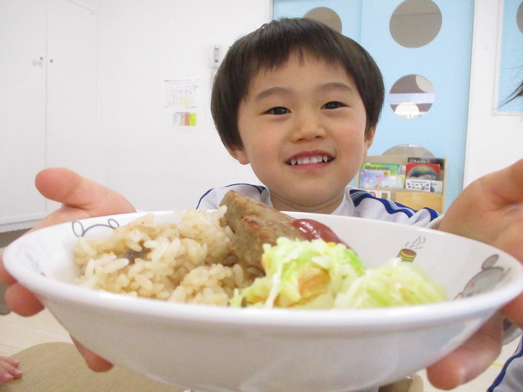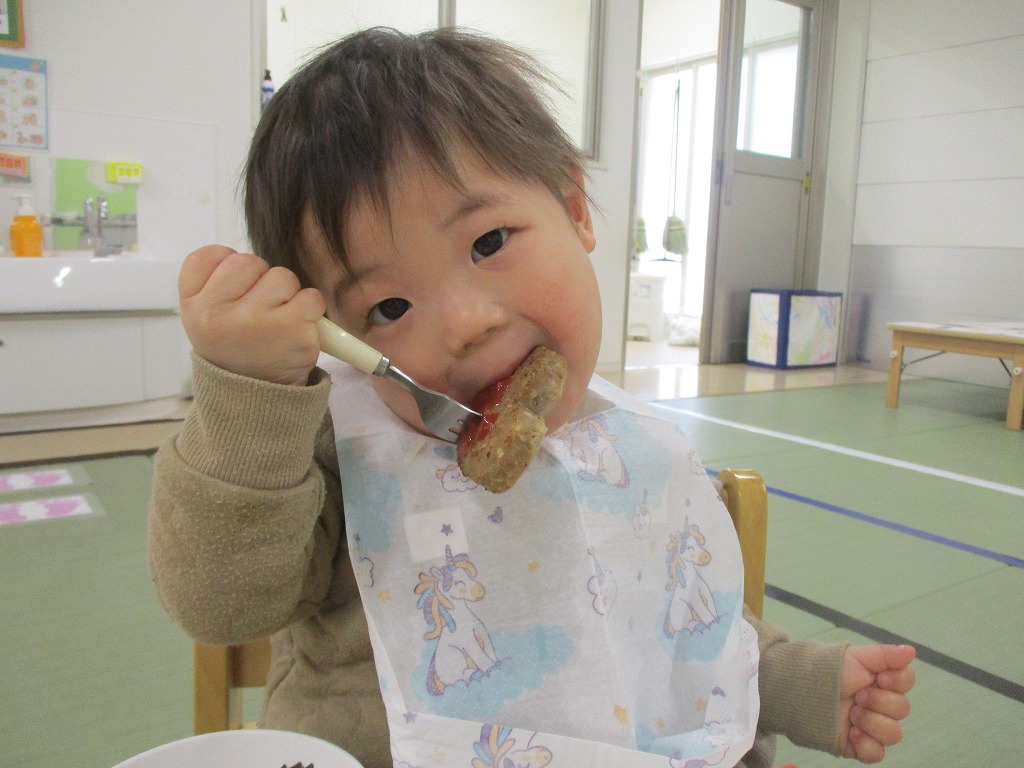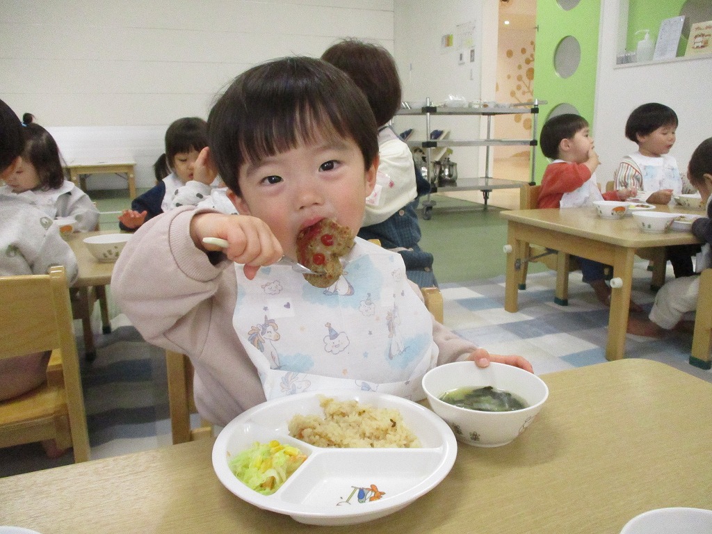 給食は、ハート型のハンバーグ。